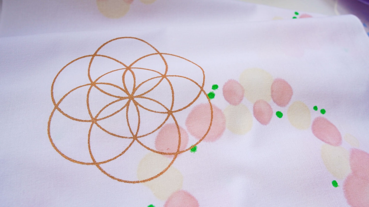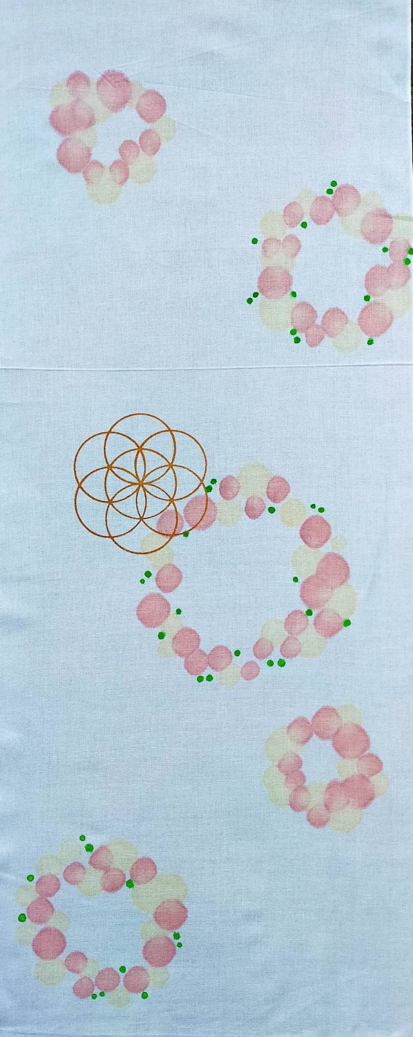 ・ベースのドット模様はベンガラ染料を使用。フラワーオブライフはシルクスクリーン印刷。